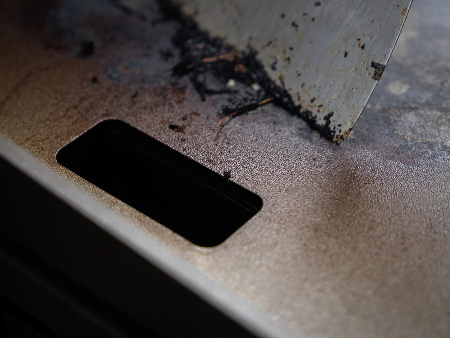 Nach der Grillsession sollte die Grillplatte direkt wieder gereinigt werden. Was normalerweise aufwendig und zeitraubend ist, funktioniert am Plancha Grill ganz leicht! Einfach gleichmäßig ein wenig Wasser auf die noch sehr heiße Plancha gießen und mit einem Wender die sich lösenden Verkrustungen zur Seite schieben. Restliche Flüssigkeit und Verschmutzungen einfach durch die Öffnung direkt in den Auffangbehälter schieben.