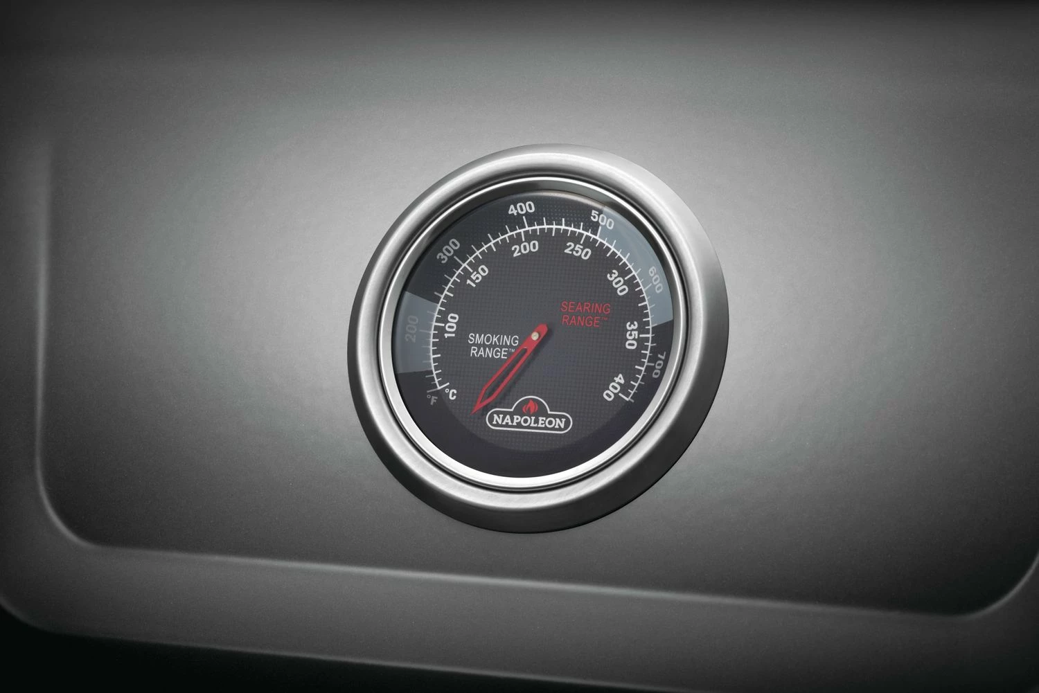 Das Deckelthermometer ACCU PROBE™ zeigt Ihnen zuverlässig die Garraumtemperatur an. Mit einer Skala von 40°C bis 370°C überwacht es den gesamten Temperaturbereich des Geräts.